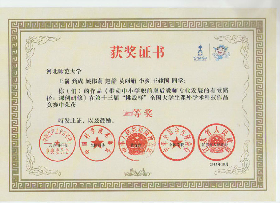 赵静 王建国 | 2012级硕士、2010级本科 | 2013年 | 国家级一等奖 | 教育部 |