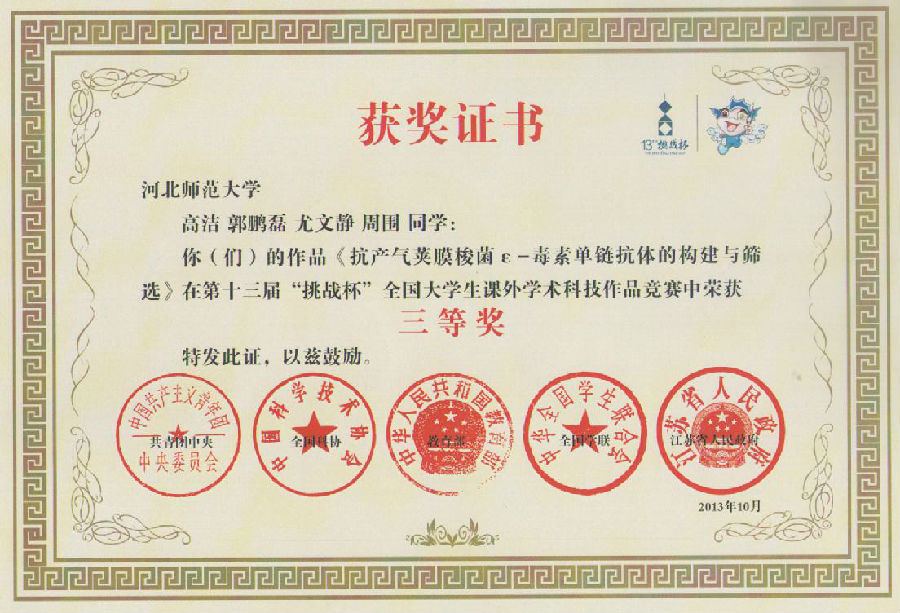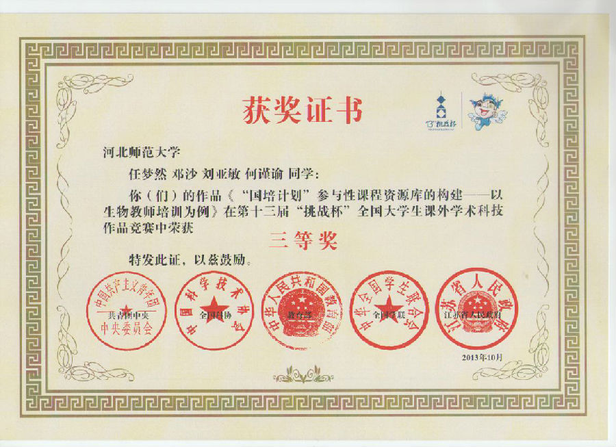 高洁、郭鹏磊 | 2010级 4年级 | 2013年 | 国家级三等奖 | 教育部 |