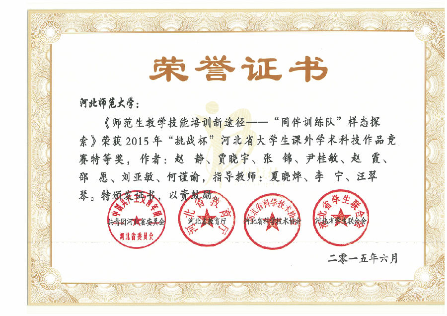 赵 静 贾晓宇 张 锦 赵 霞 尹桂敏 | 2012级 | 2015年 | 河北省特等奖 | 省教育厅 |