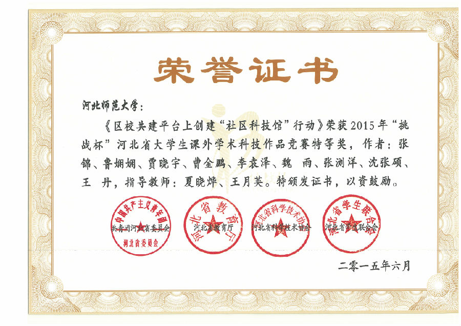 张 锦 鲁娴娴 | 2013级 | 2015年 | 河北省特等奖 | 省教育厅 |
