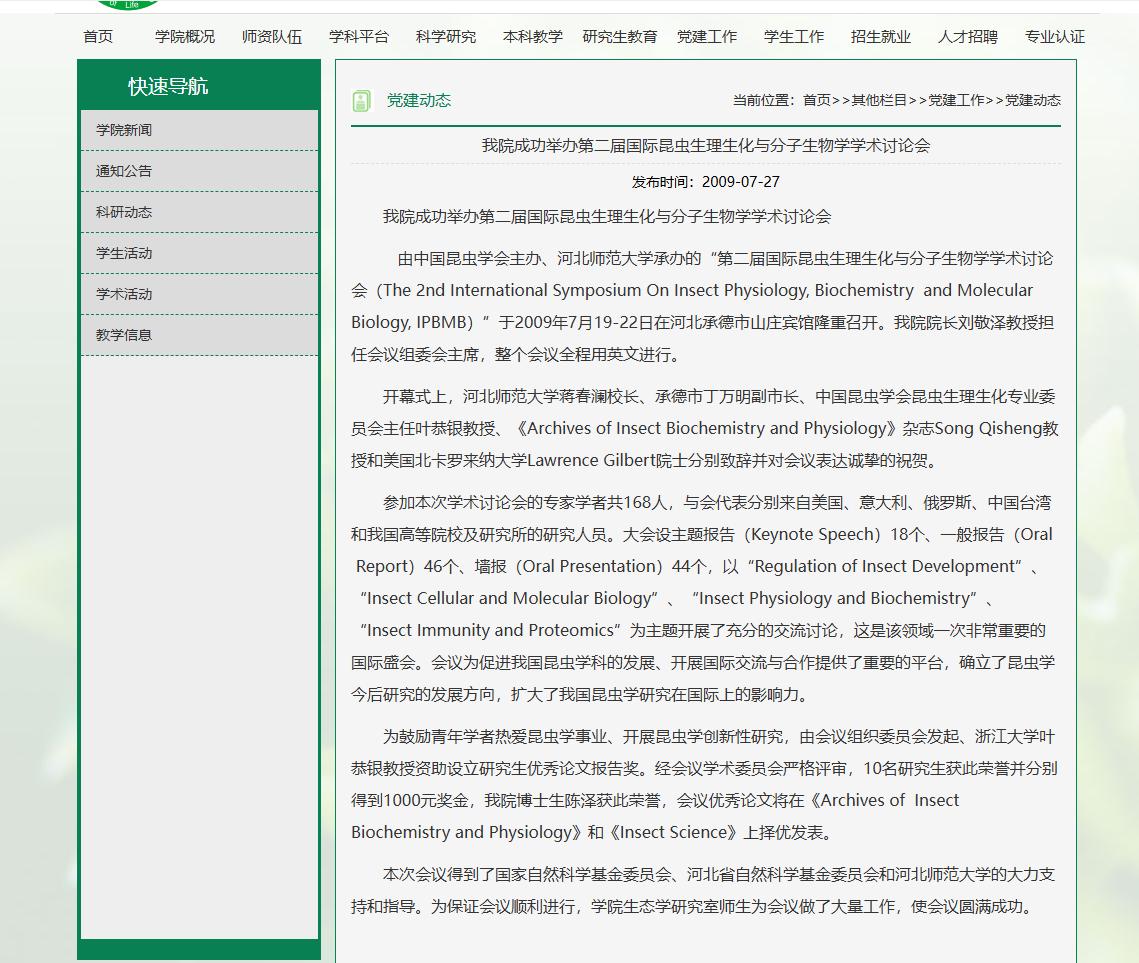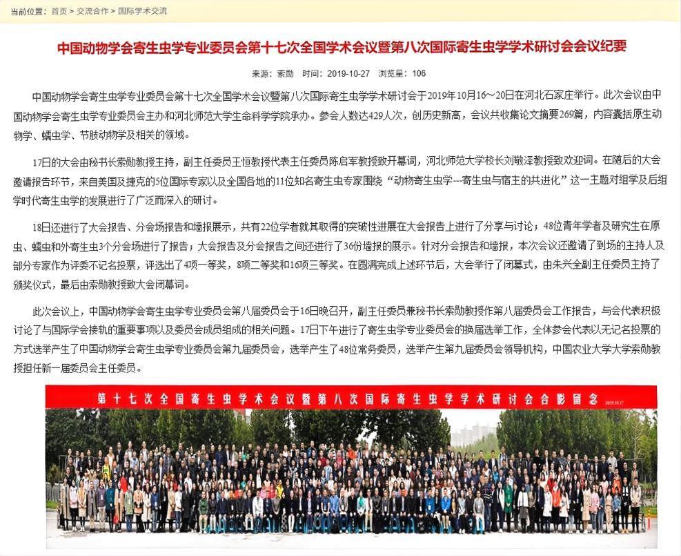 主办国际学术活动:主办承办中国动物学会寄生虫学专业委员会第十七次全国学术会议暨第八次国际寄生虫学学术研讨会、第二届国际昆虫生理生化与分子生物学学术研讨会等国际学术会议,吸引海外知名专家或学生来学院和学校交流,在校内为研究生创造国际化学术交流环境。